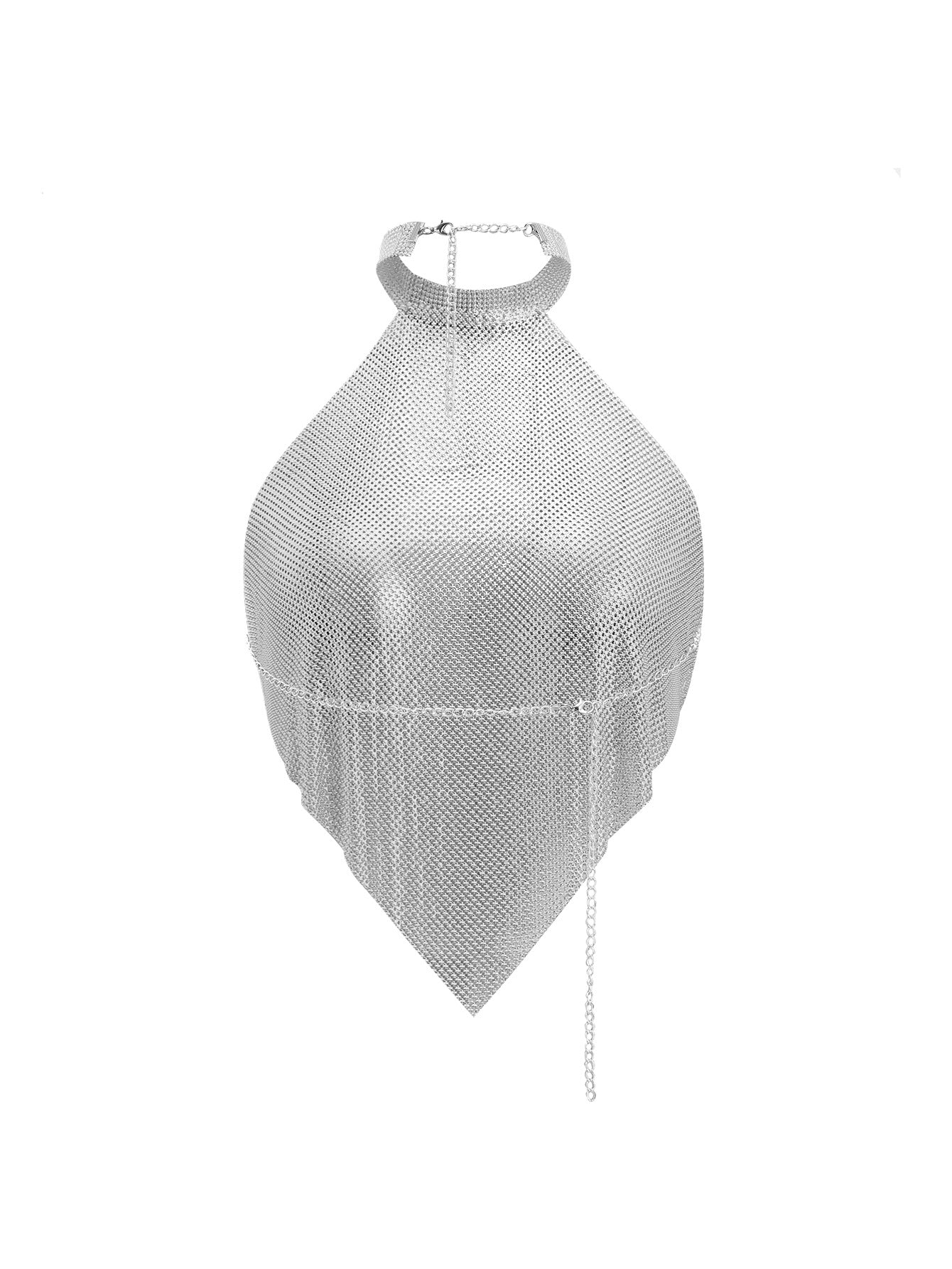 Womens Rhinestone Halter Top | Sparkly Backless Crop Top, Silver Chain | noémi
