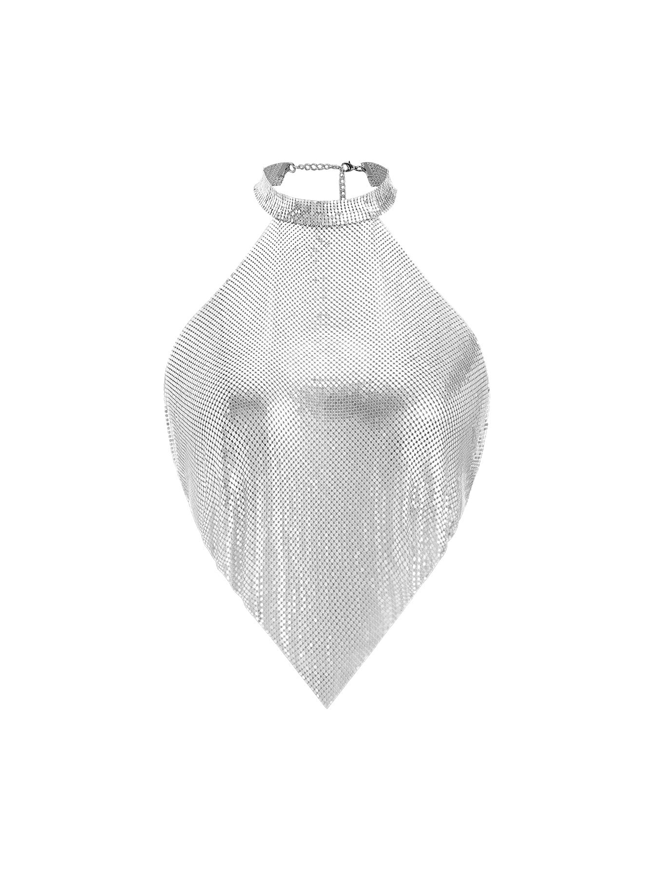 Step into the spotlight with the noémi Metal Mesh Halter Top — the ultimate statement piece for your nightlife wardrobe.