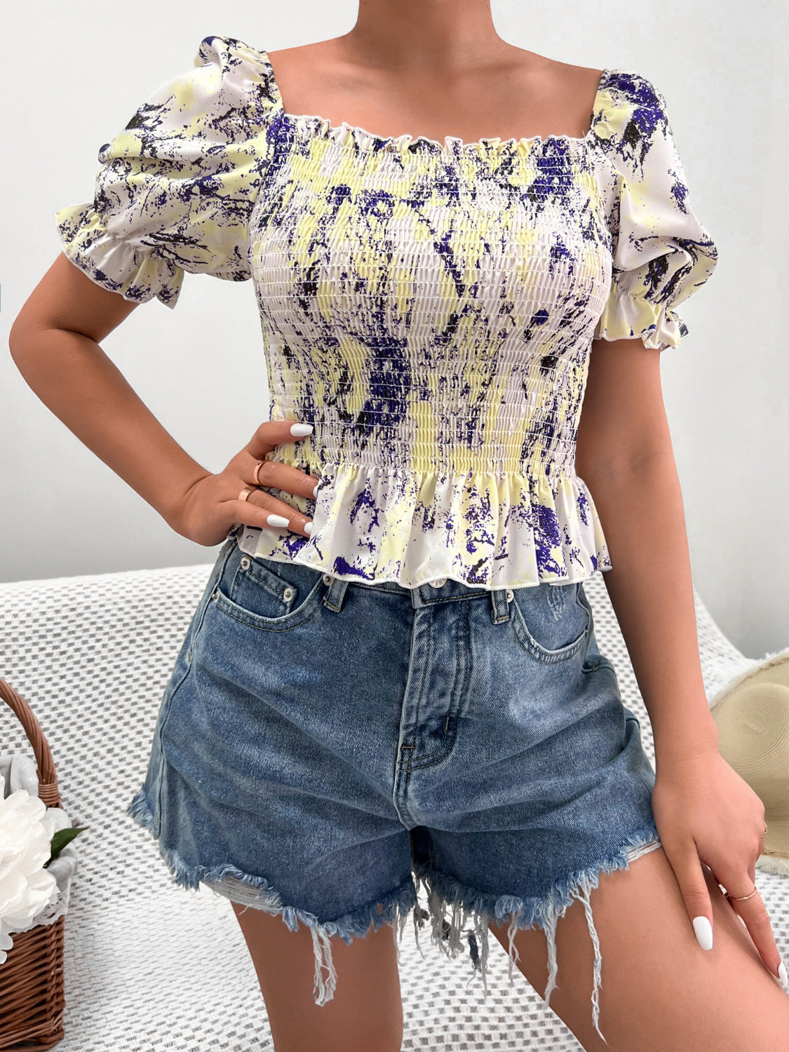 Womens Sleeve Smocked Top | Ruffle Hem, Leopard Print, Off Shoulder | noémi