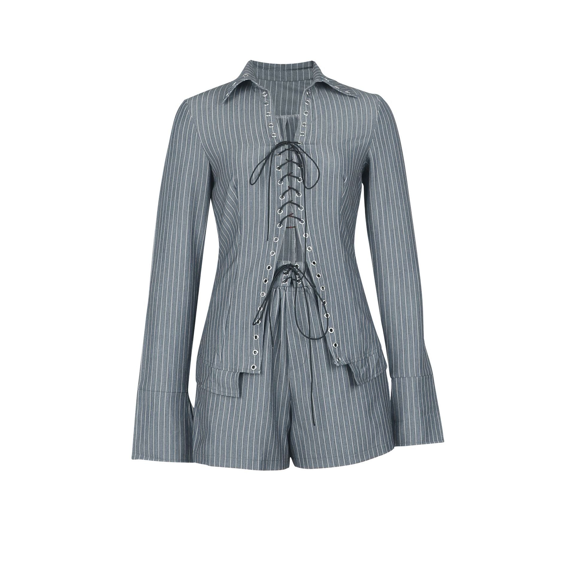 Womens Striped Lace Up Shirt & Shorts Set | Casual Long Sleeve Collared Top & High Waist Shorts | noémi