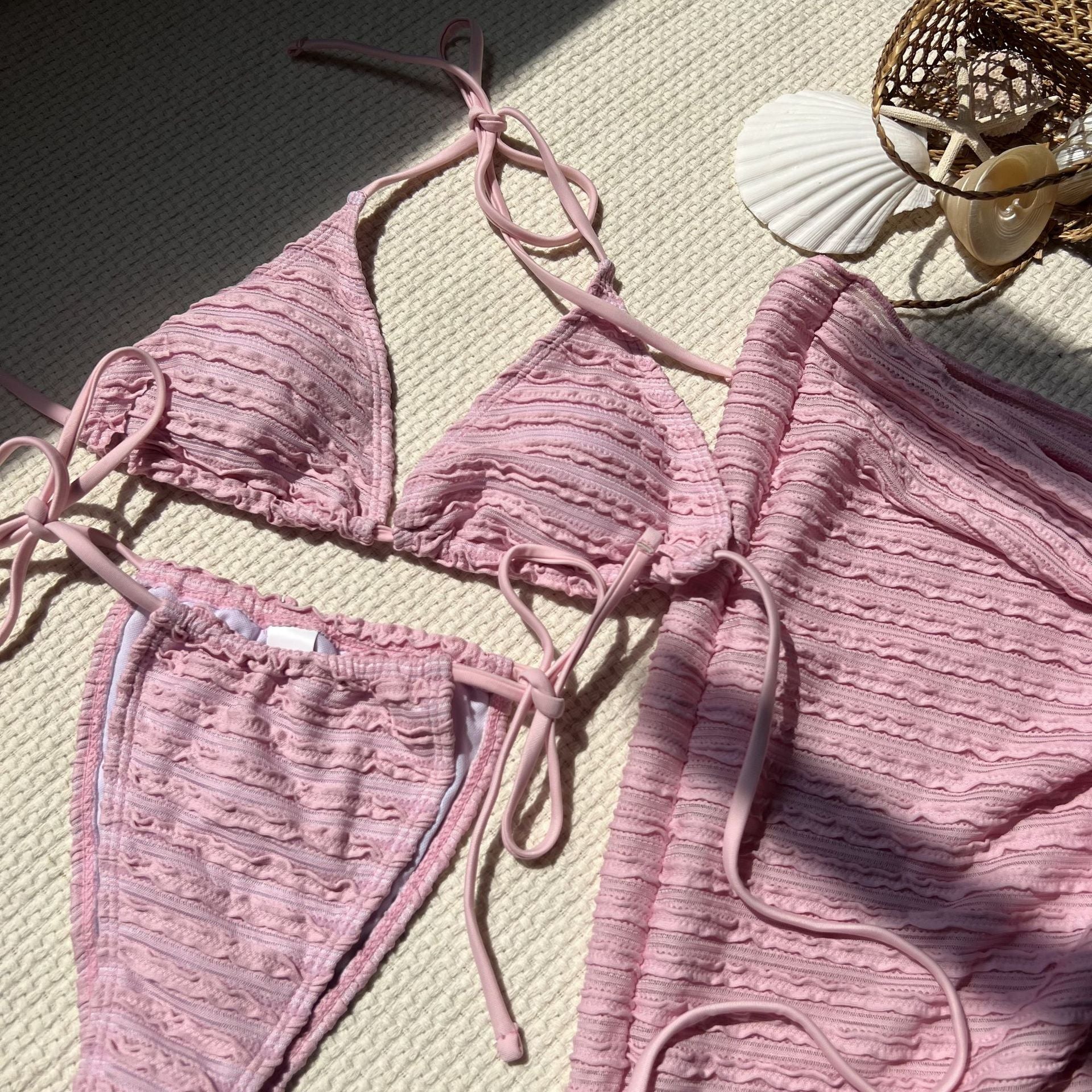 This 3-Piece Women's Swimwear Set includes a bikini top, matching bottoms, and a lightweight cover-up made from special textured fabric that feels as good as it looks.