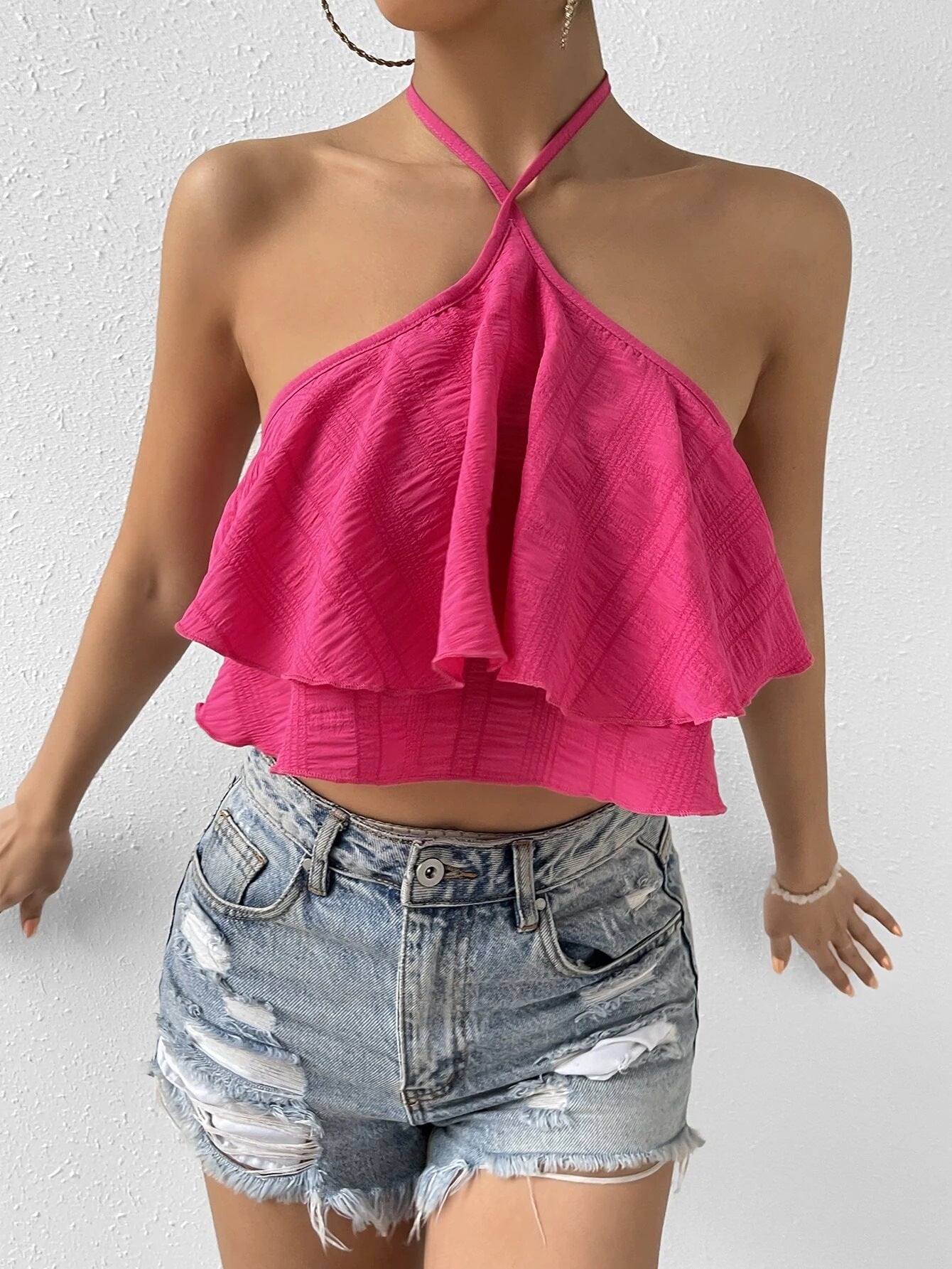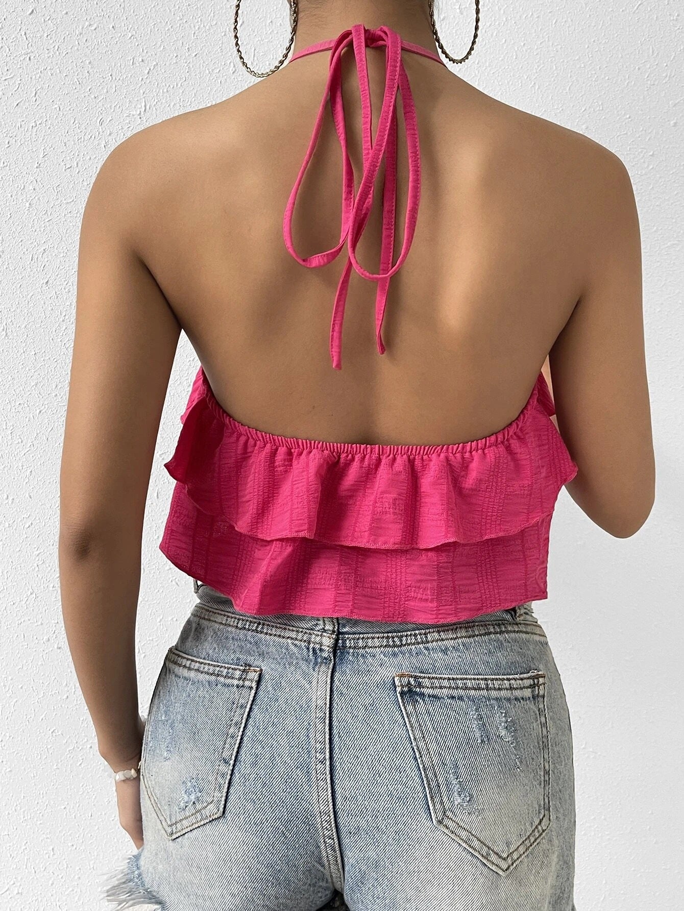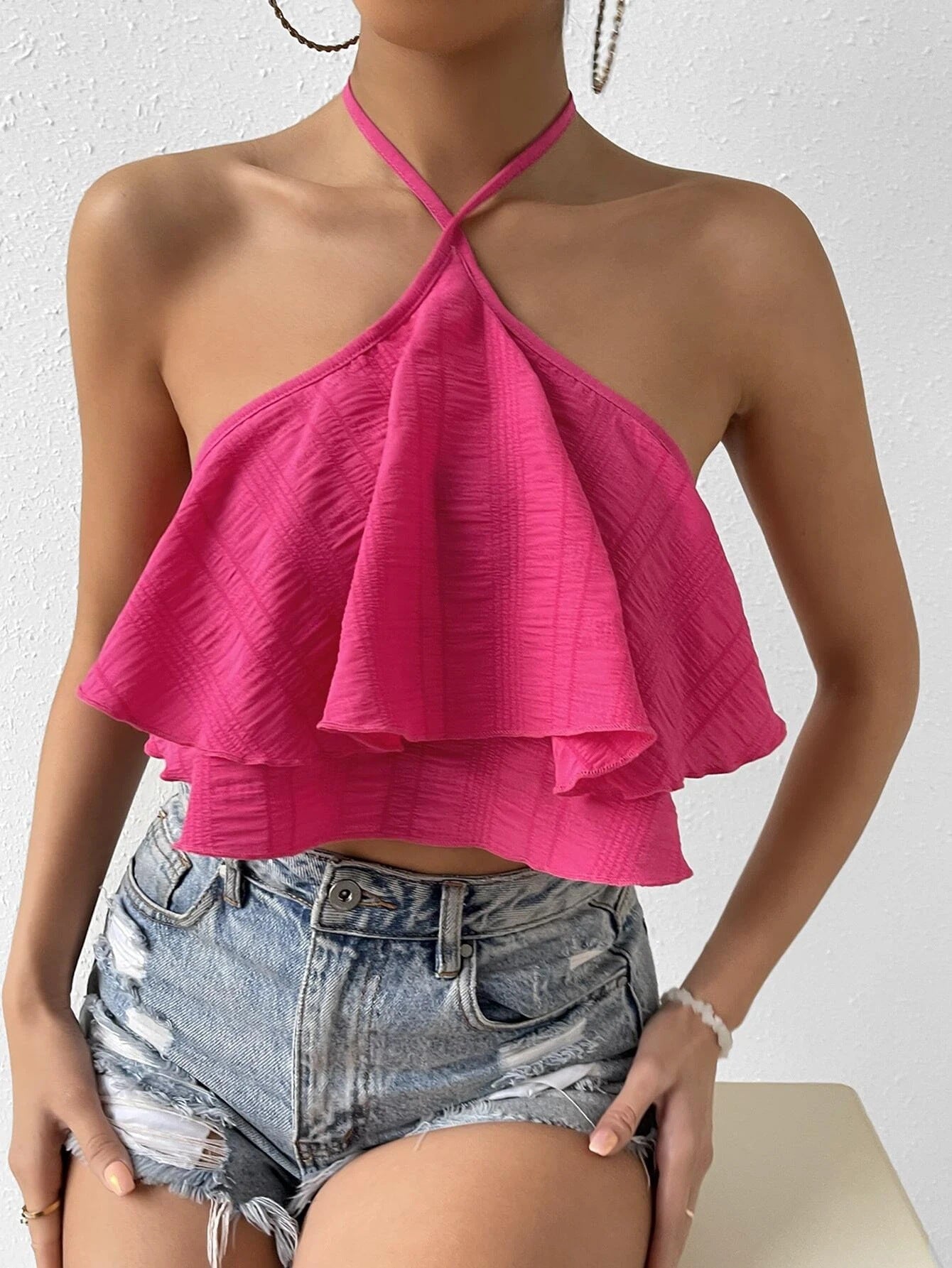 Make a bold statement in our noémi Summer Halter Sleeveless Top the ultimate combination of sexy, flirty, and chic. With its double-layered ruffle detail, open back design, and eye-catching pink color, this top is made to stand out.