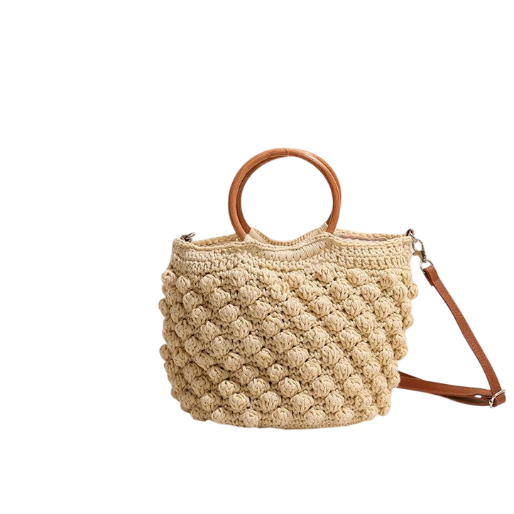Hand-woven straw crossbody trimmed with a wooden ring delivers effortless boho style for beaches, markets and festivals—yet weighs only 420 g so you stay light on the go.